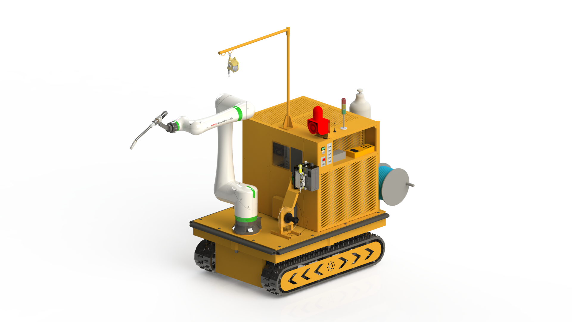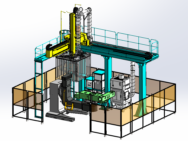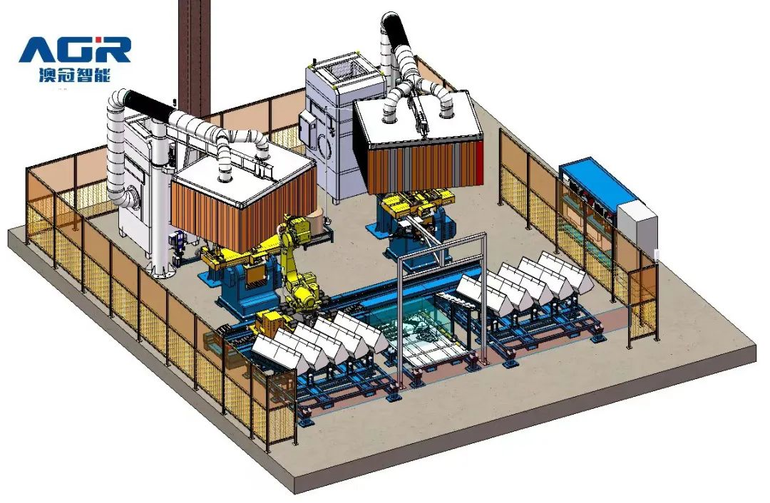 5机联动机器人焊接系统;变位机承载能力达到1吨,适用于多型号动臂斗杆结构件的焊接;反变形及夹紧定位一体化设计伺服夹具,与工件自 动化柔性输送系统配合,可实现多种型号工件的自动装夹。