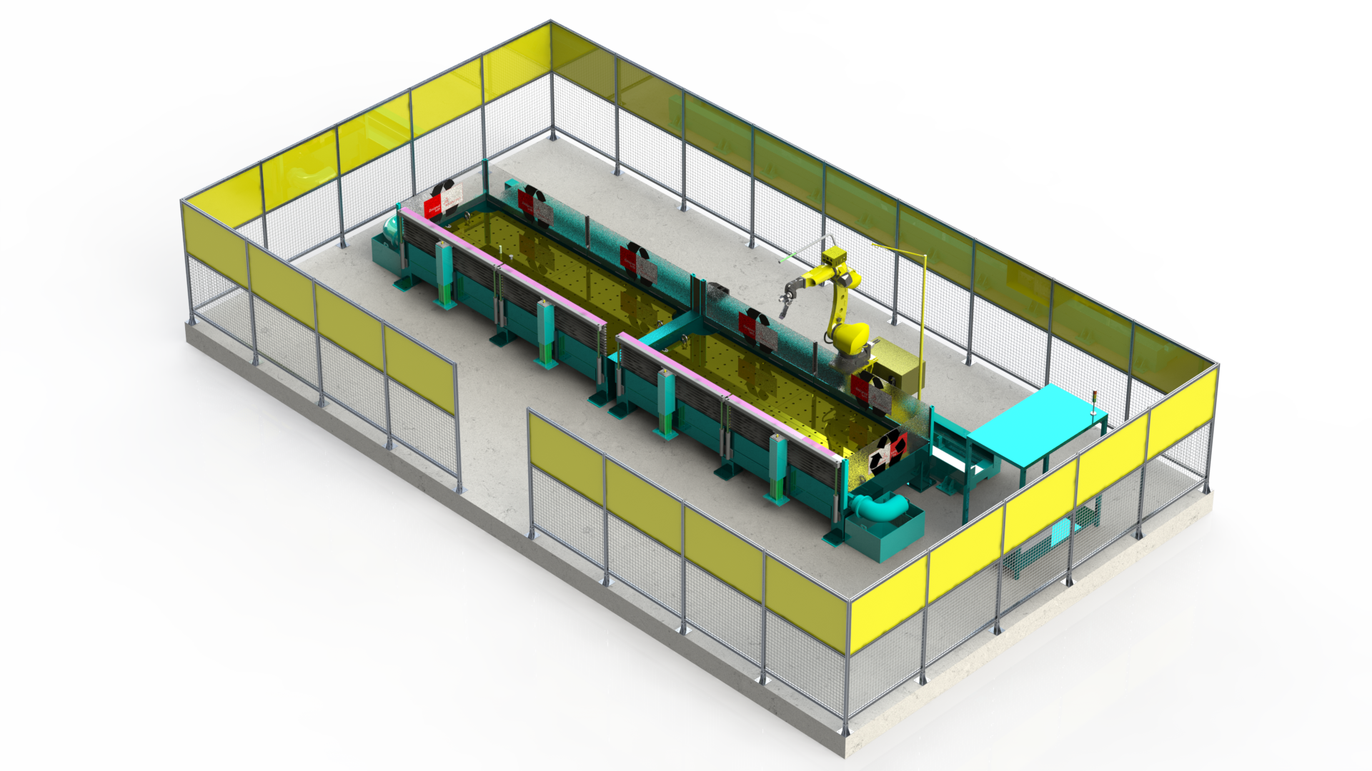 5机联动机器人焊接系统;变位机承载能力达到1吨,适用于多型号动臂斗杆结构件的焊接;反变形及夹紧定位一体化设计伺服夹具,与工件自 动化柔性输送系统配合,可实现多种型号工件的自动装夹。