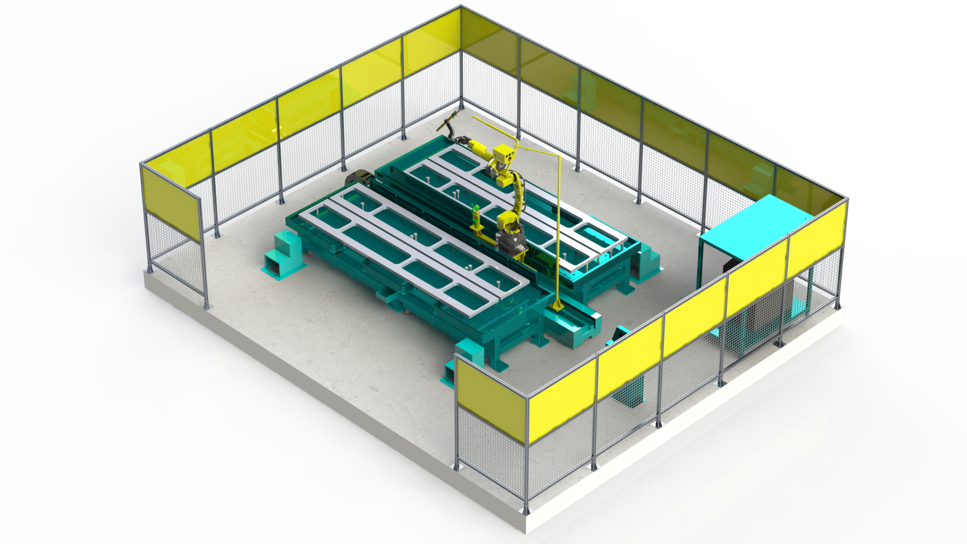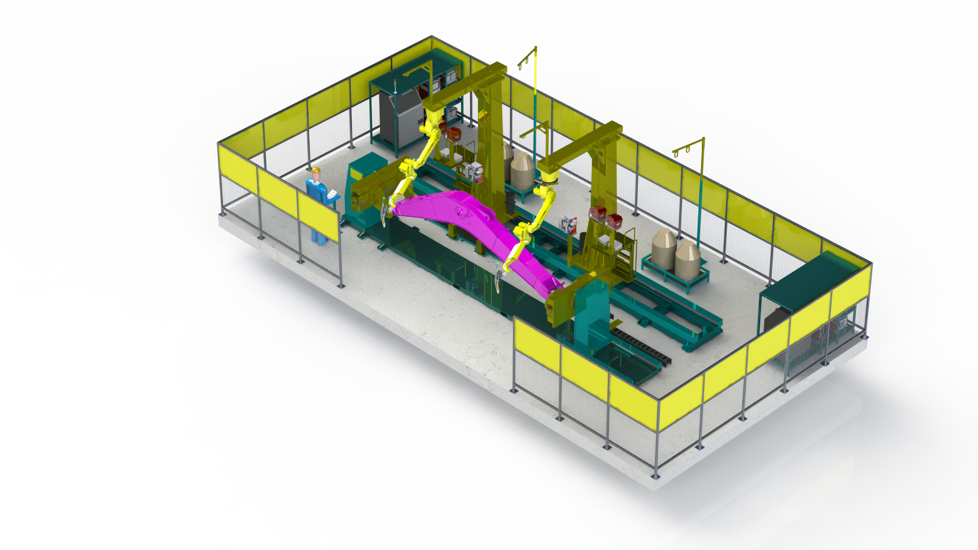 5机联动机器人焊接系统;变位机承载能力达到1吨,适用于多型号动臂斗杆结构件的焊接;反变形及夹紧定位一体化设计伺服夹具,与工件自 动化柔性输送系统配合,可实现多种型号工件的自动装夹。